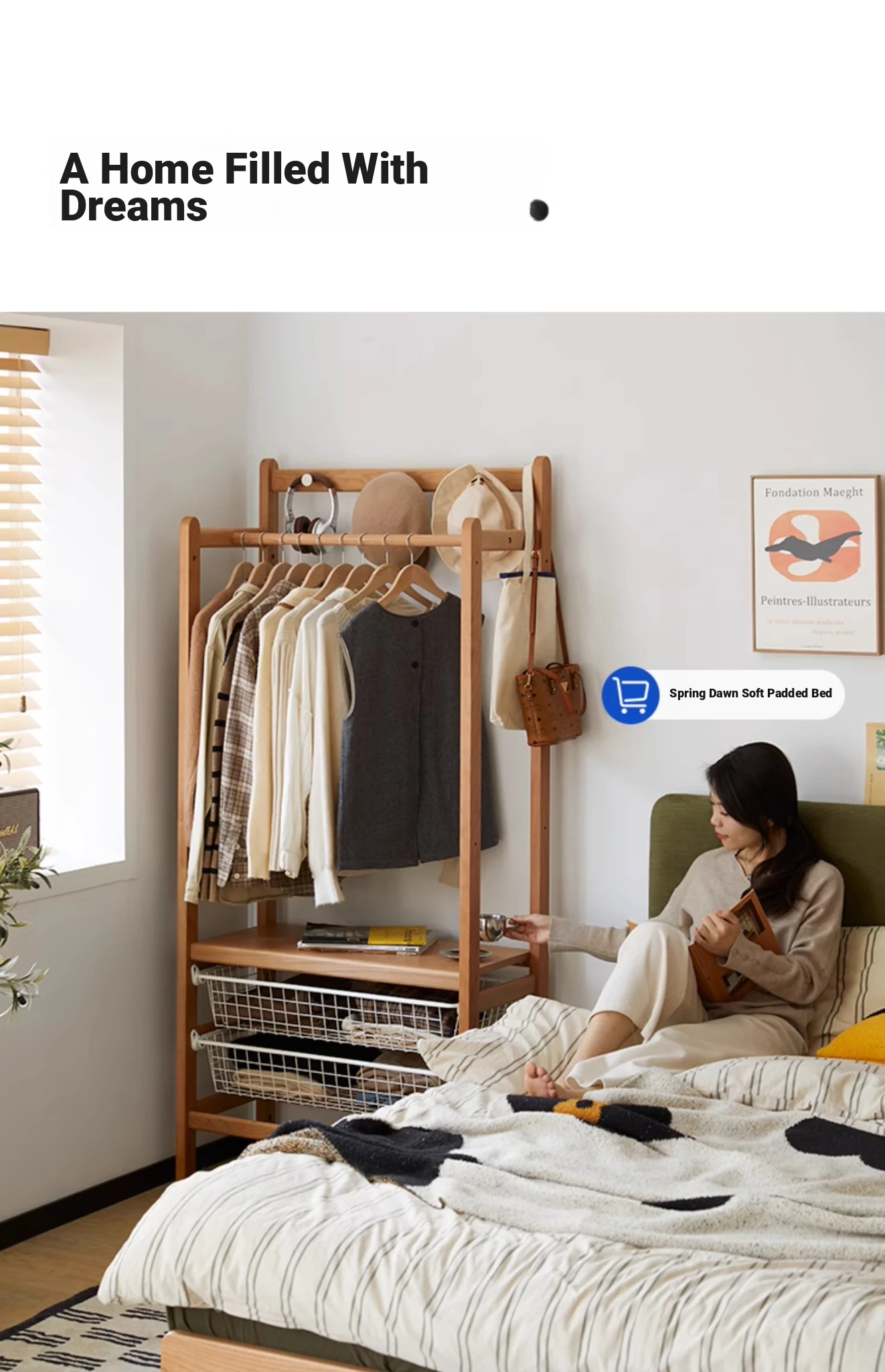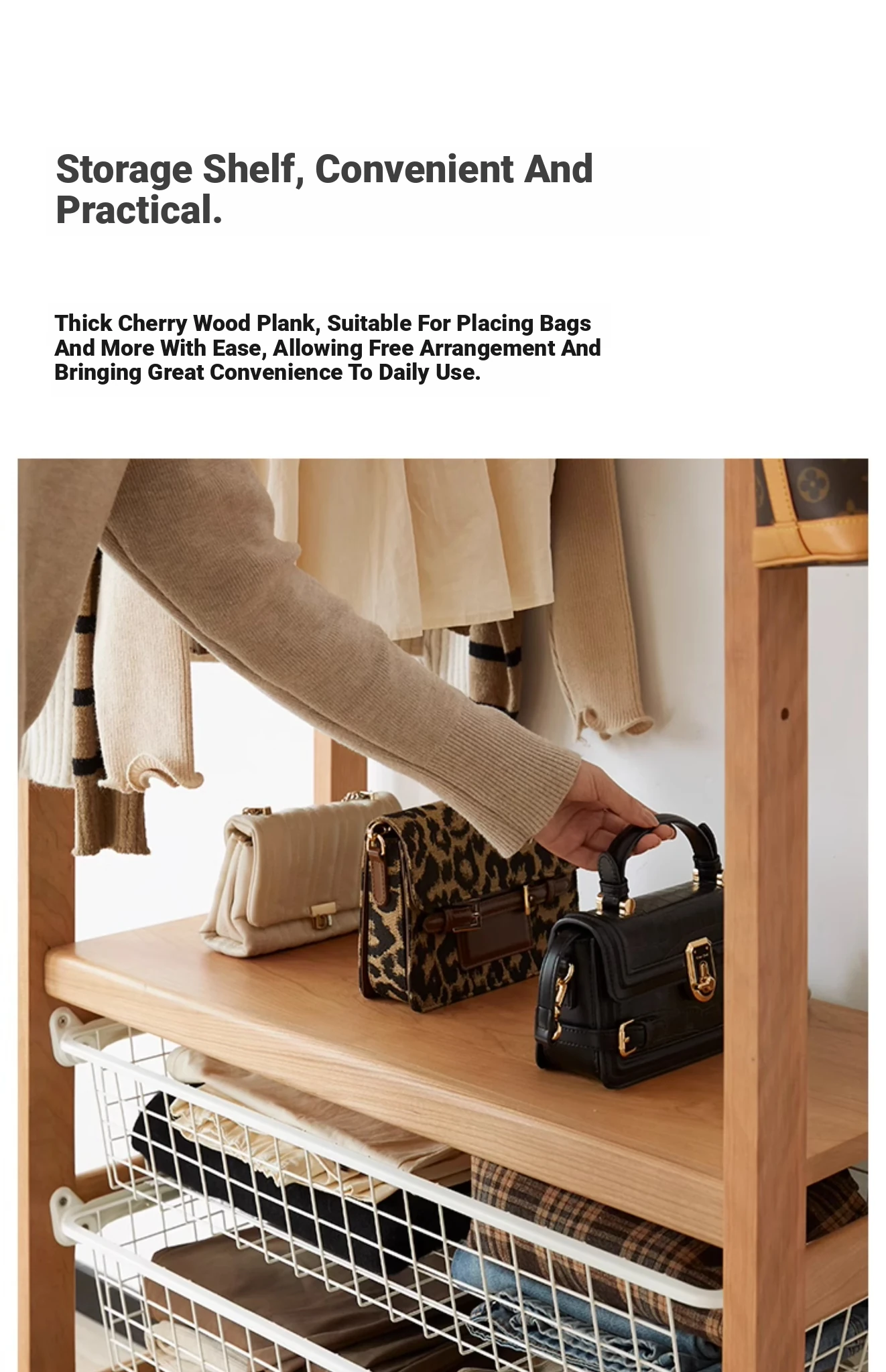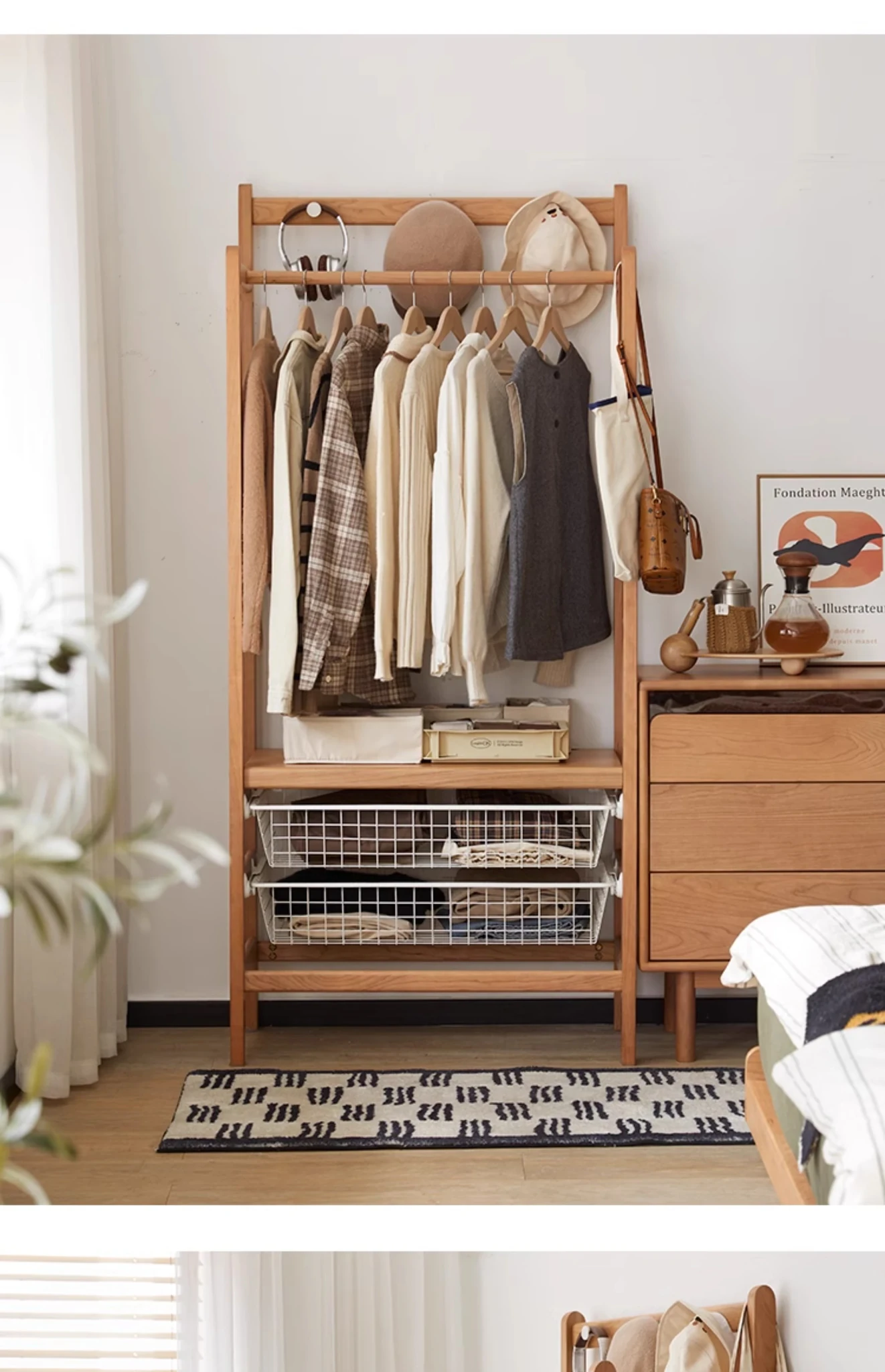 "Nordic Solid Wood Coat Rack with Storage Baskets - Elegant Cherry Wood Floor Standing Clothes Hanger for Bedroom Organization"